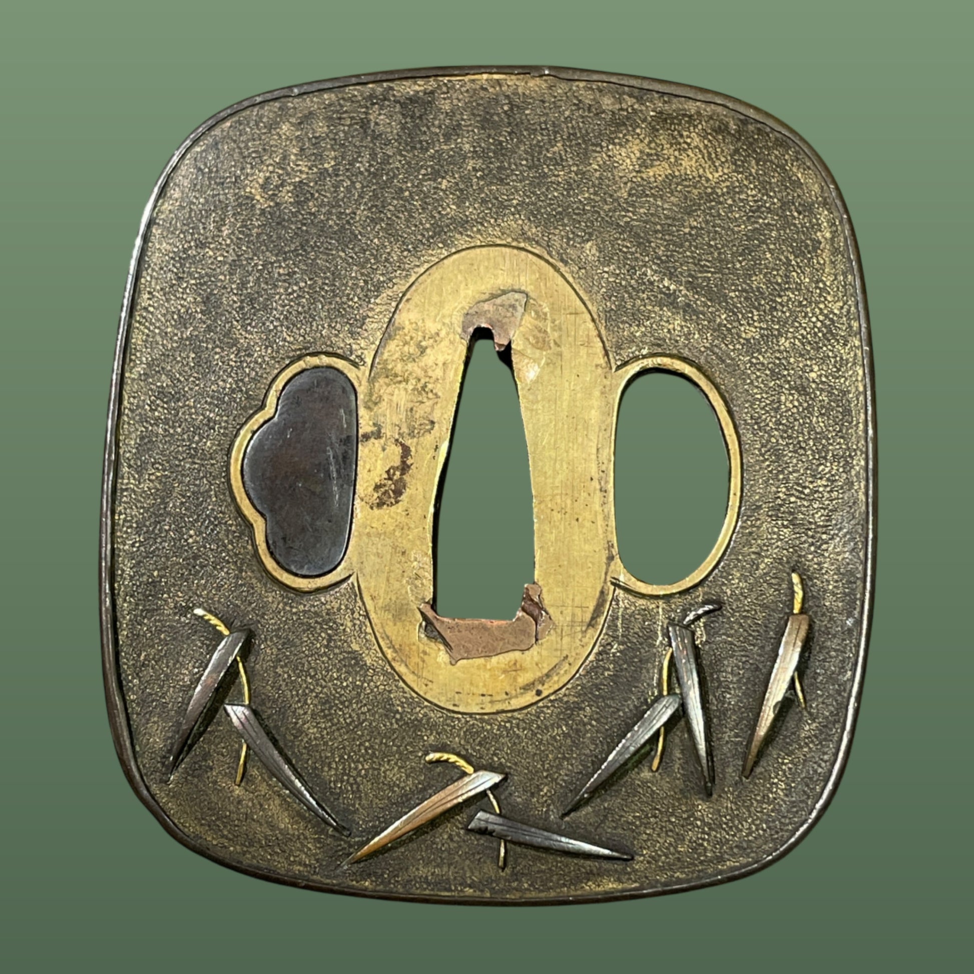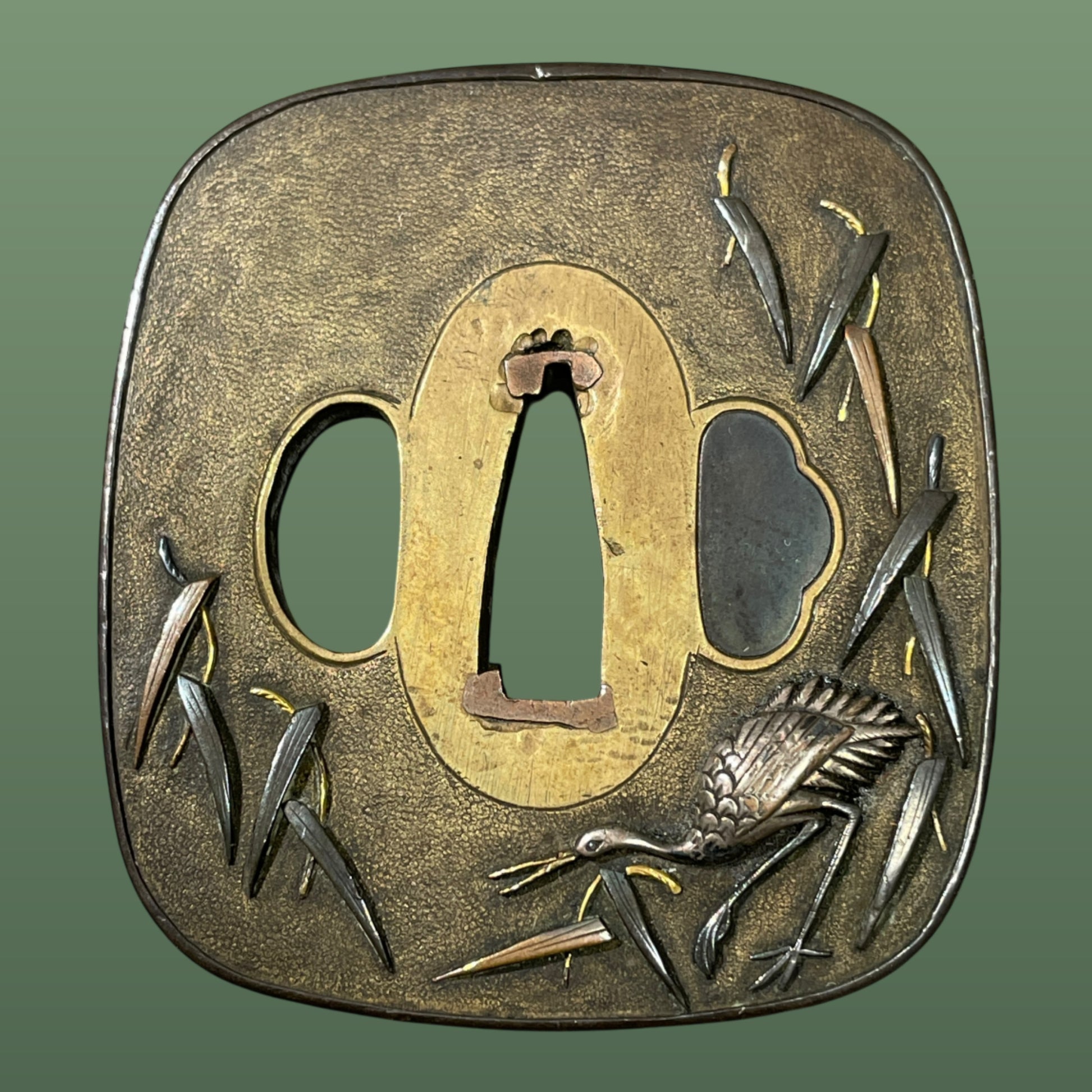鷺図庄内金工鍔 (Sagi Shonaikinko), Heron Tsuba, Brass Back, Late Edo period