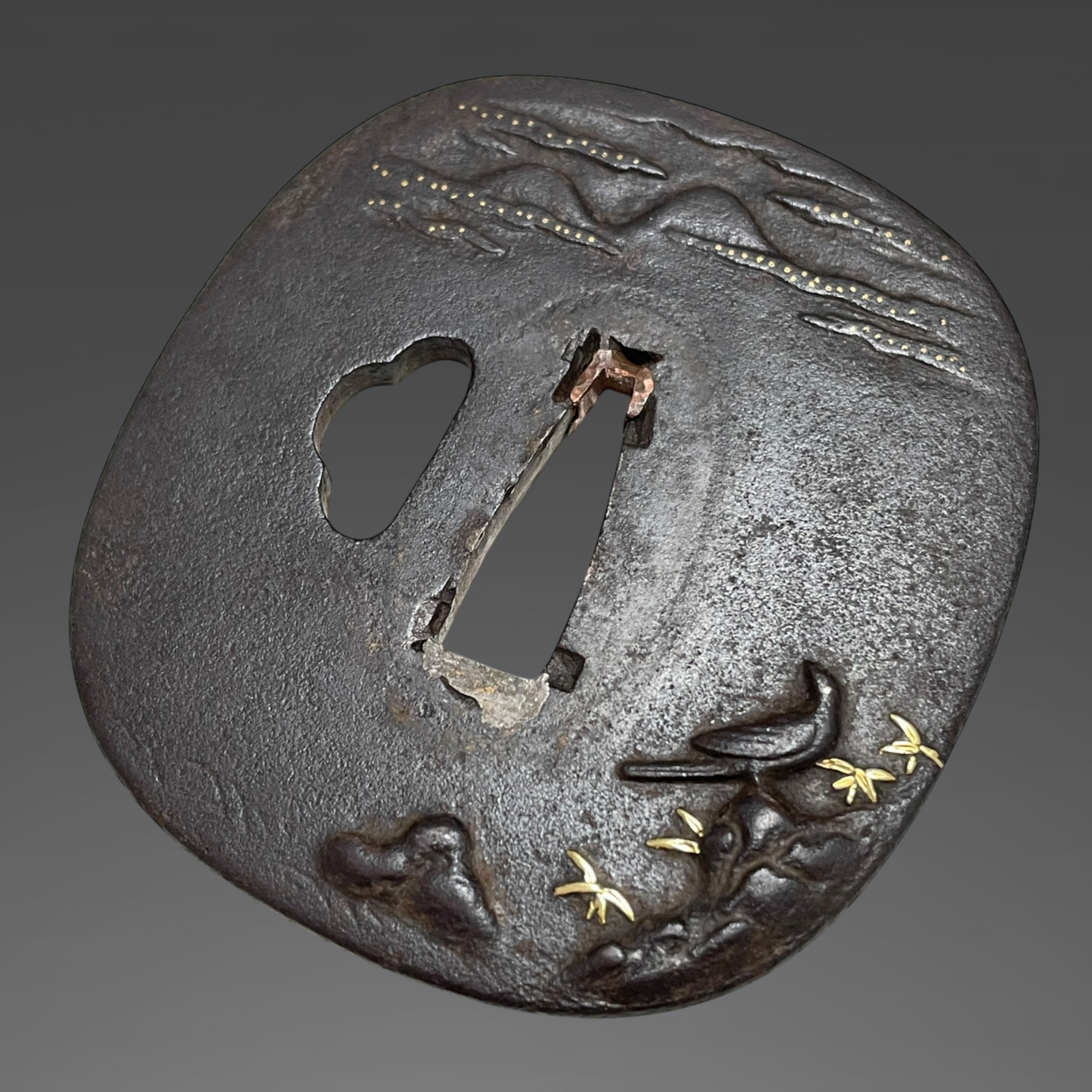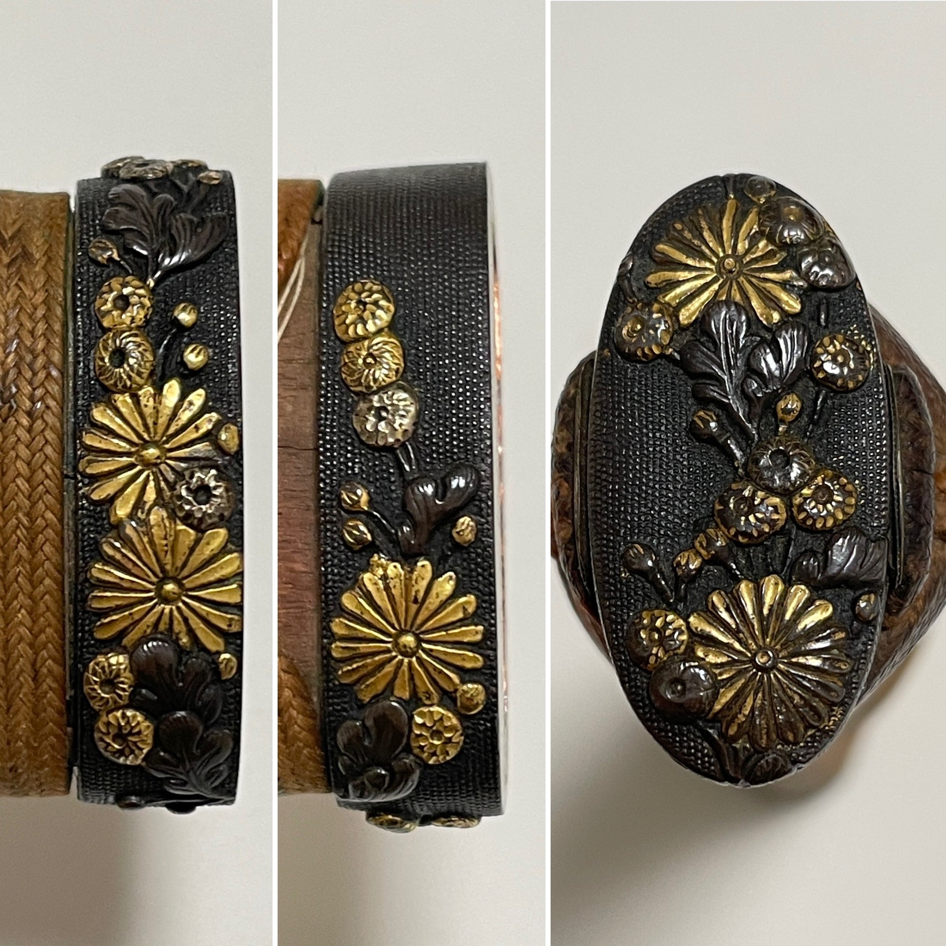 Fuchikashira with floral designs, Habaki with a silver cover featuring vertical lines.
