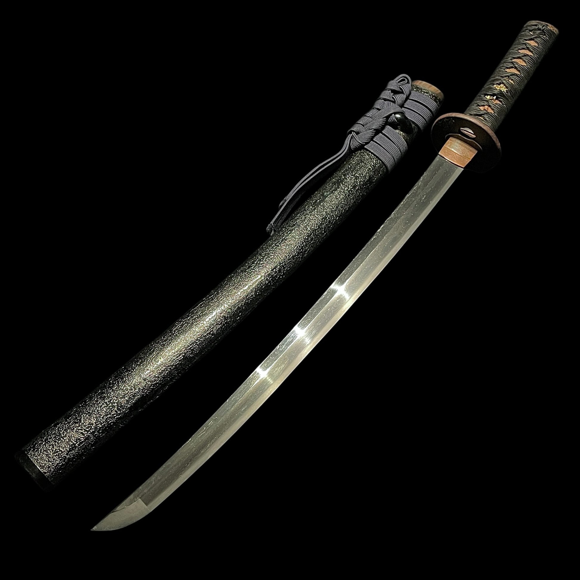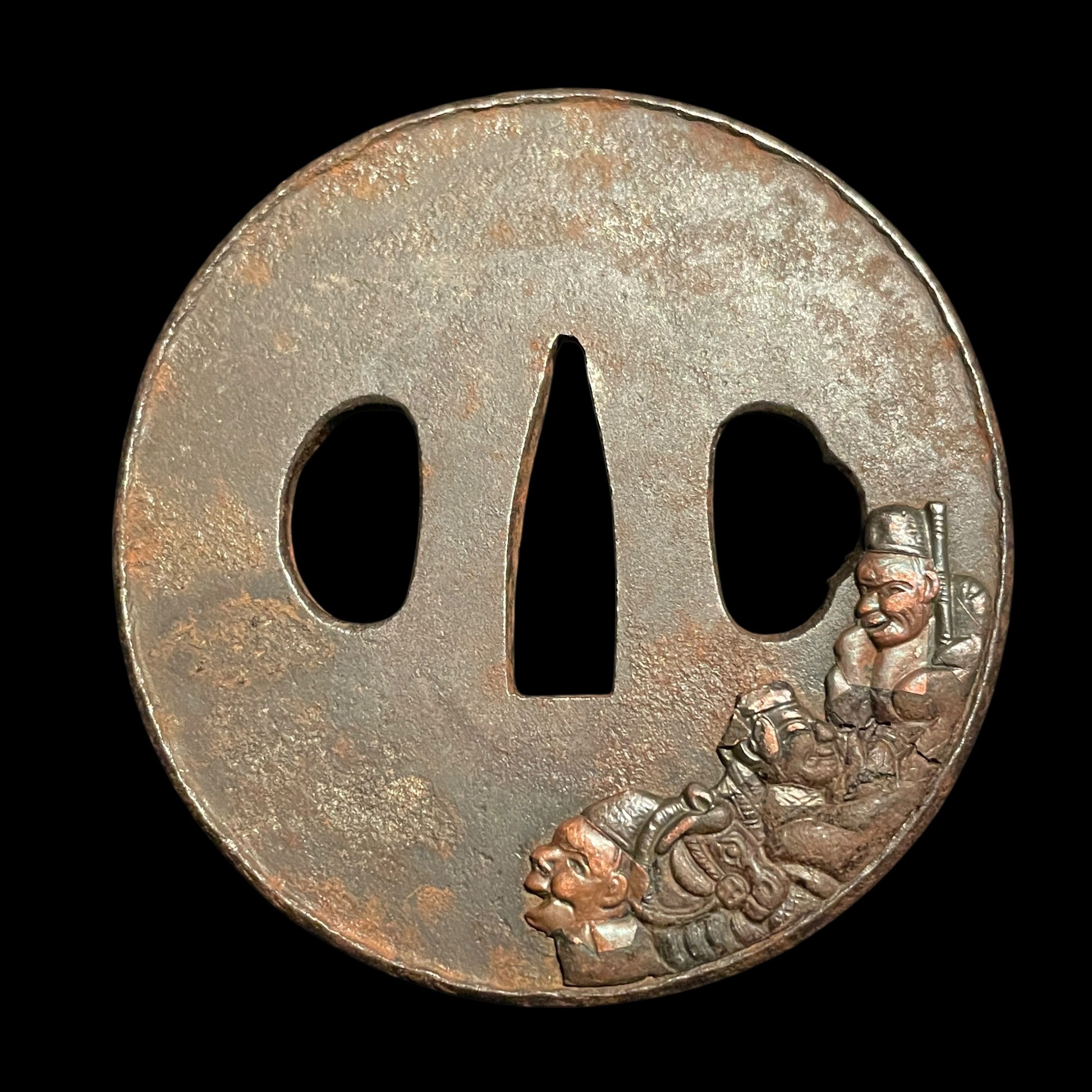 Black Suguha Wakizashi, Jinbutsu-Tsuba 人物図鍔, Edo period mumei