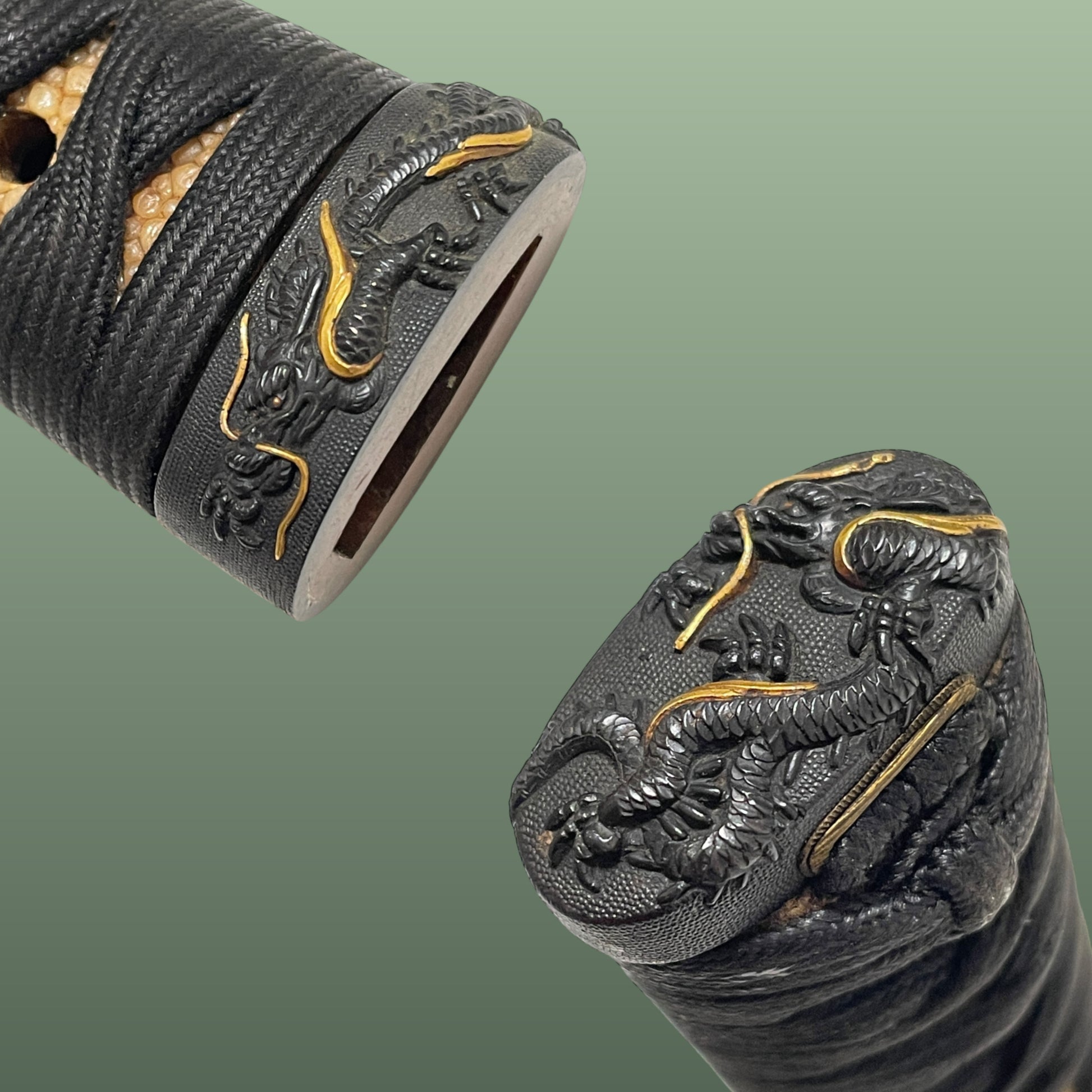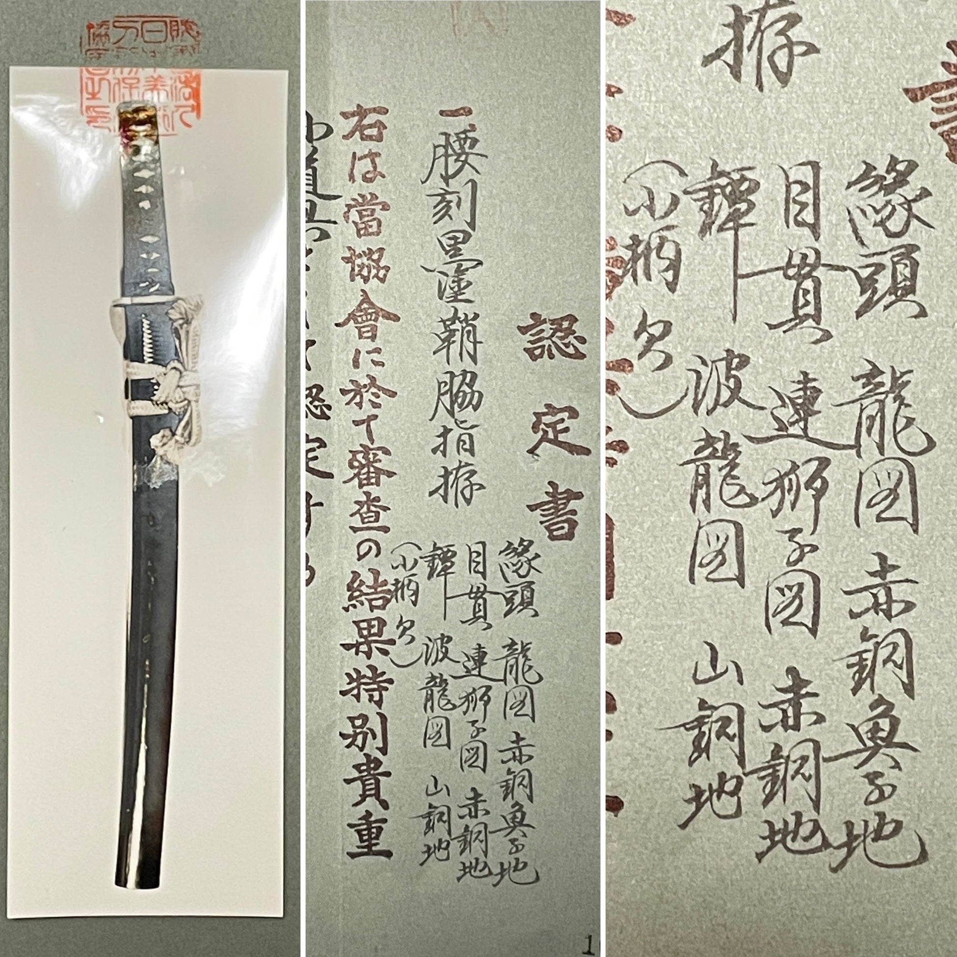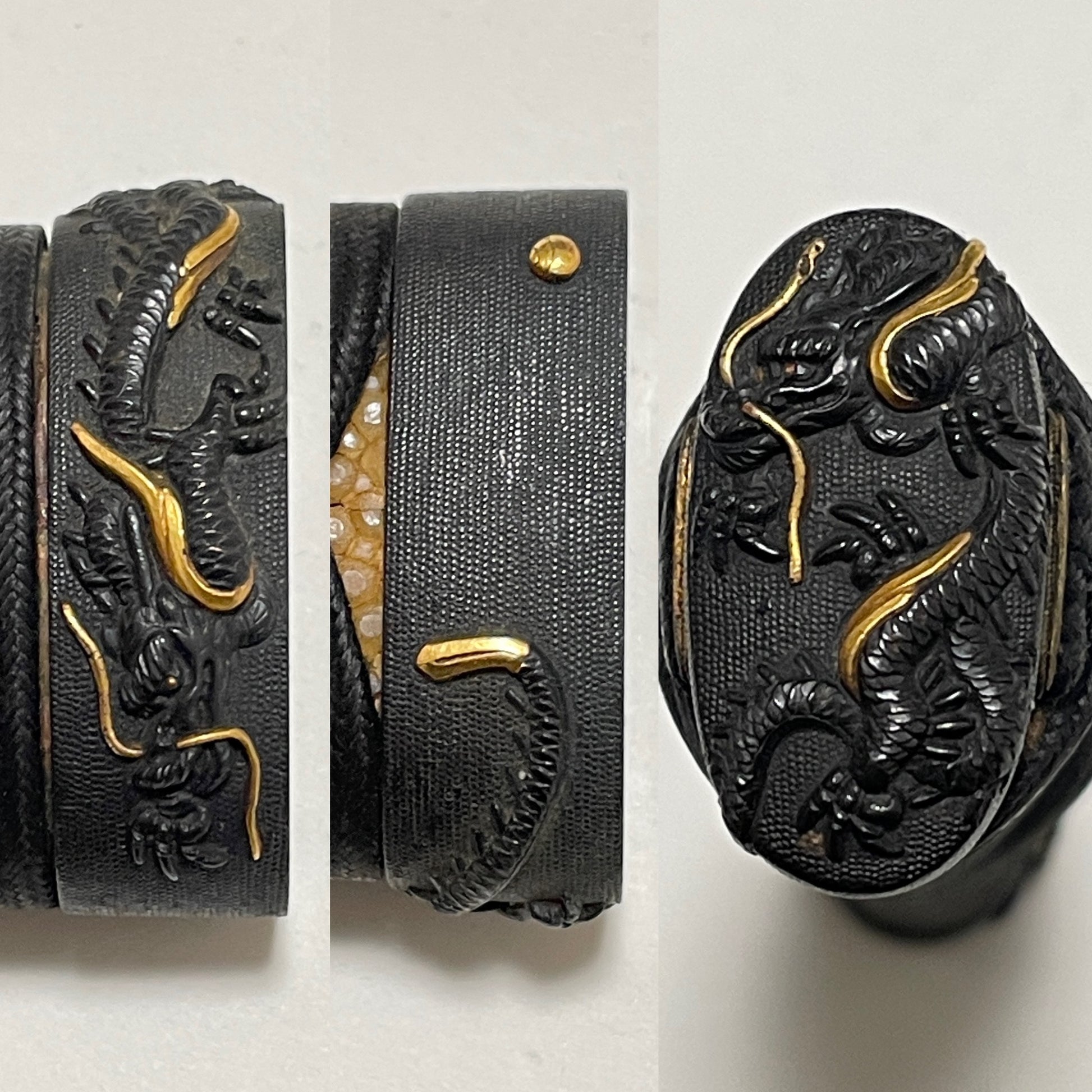 Dragon Fittings 龍一作 Koshirae For Wakizashi, 腰刻黒鞘脇指拵, Edo period, NBTHK Certificate