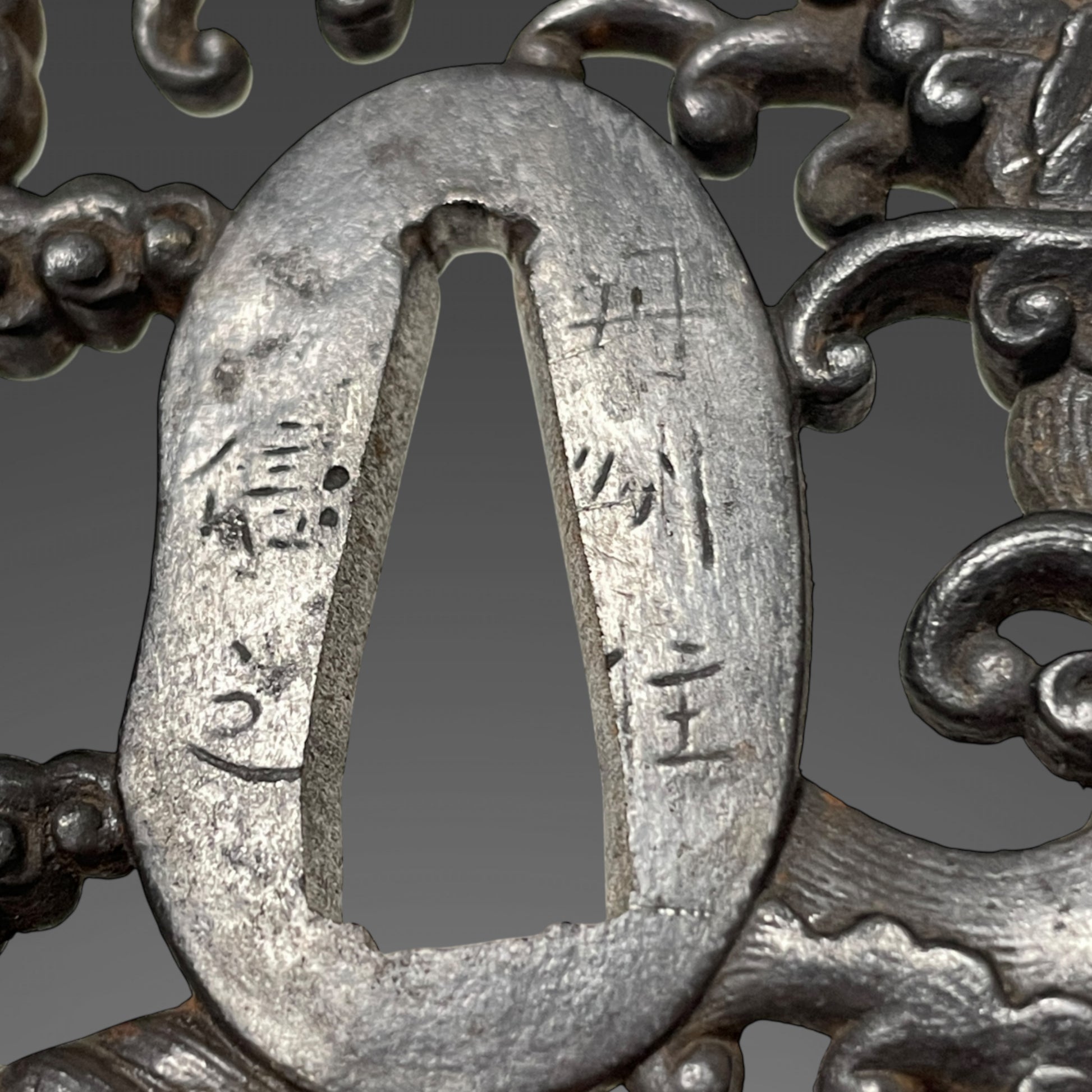 波頭鉄透鍔 丹州住信之 (Namigashira Tetsu Sukashi Tsuba, Tanshuju Nobuyuki signed).