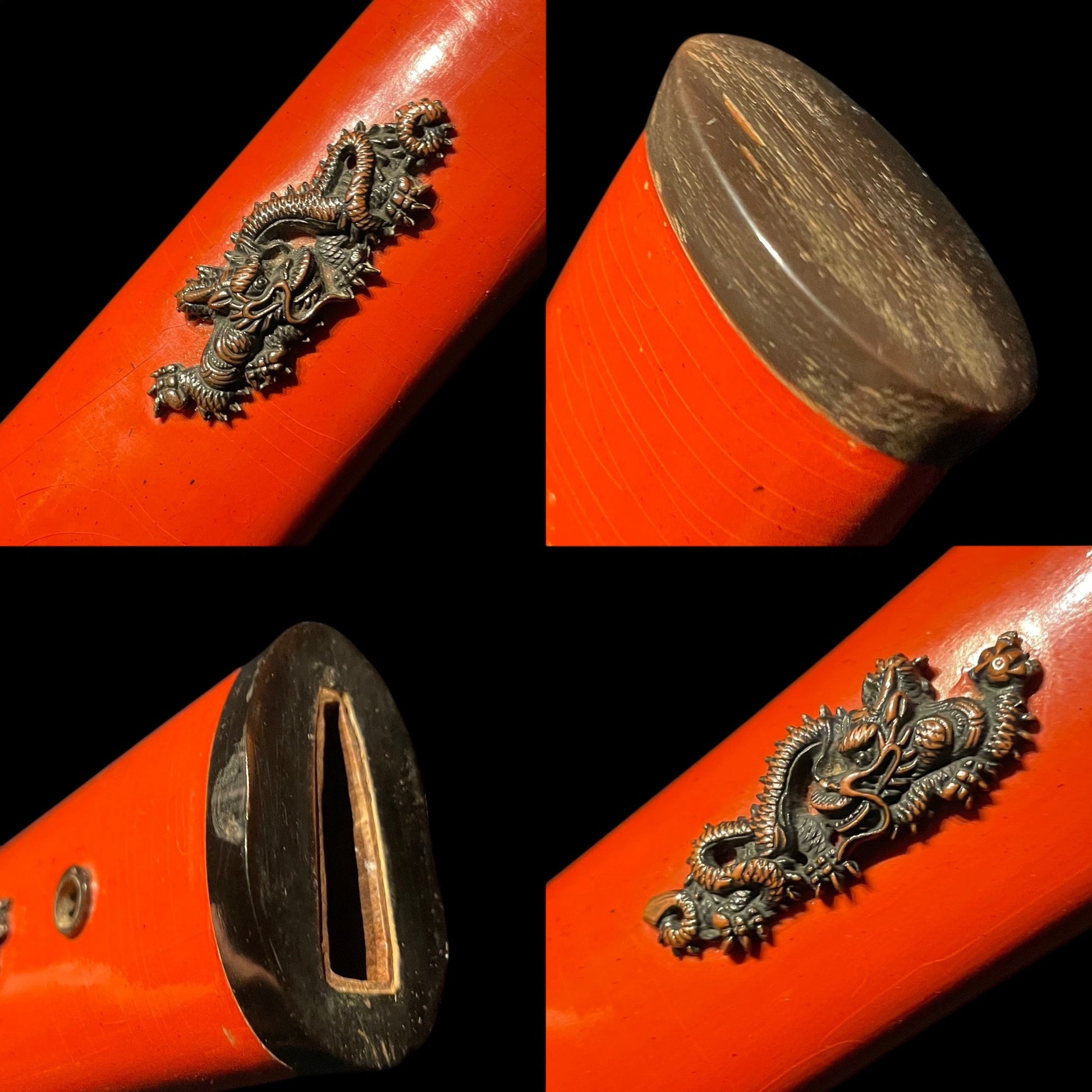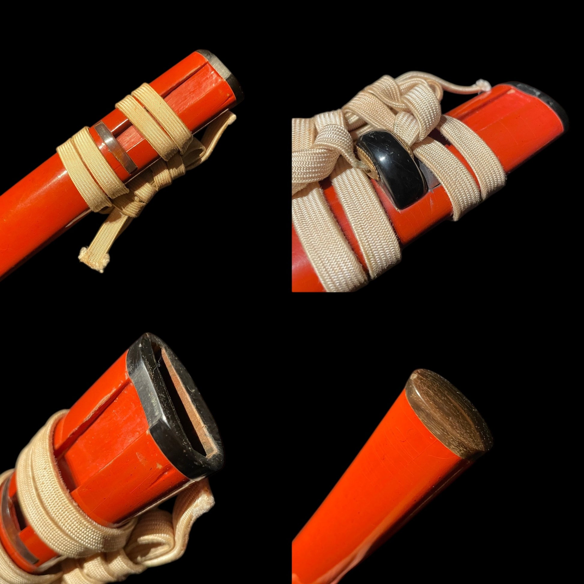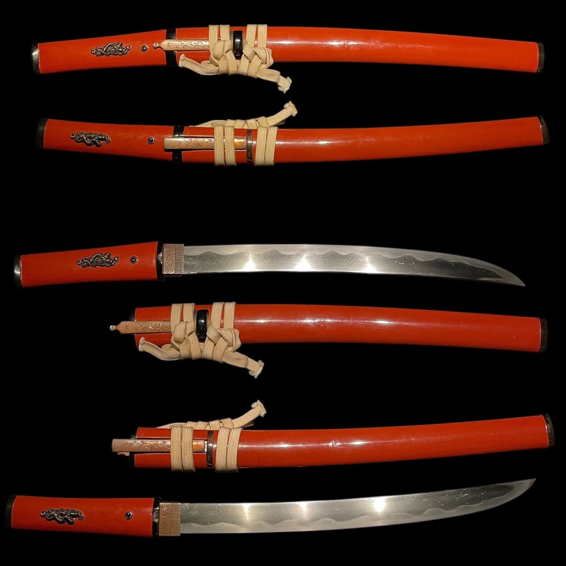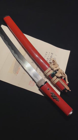 The blade is wrapped in an interesting red Koshirae and is made very wide.