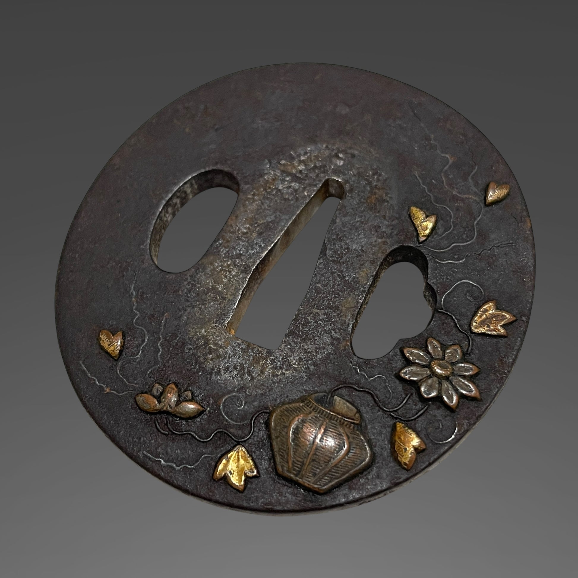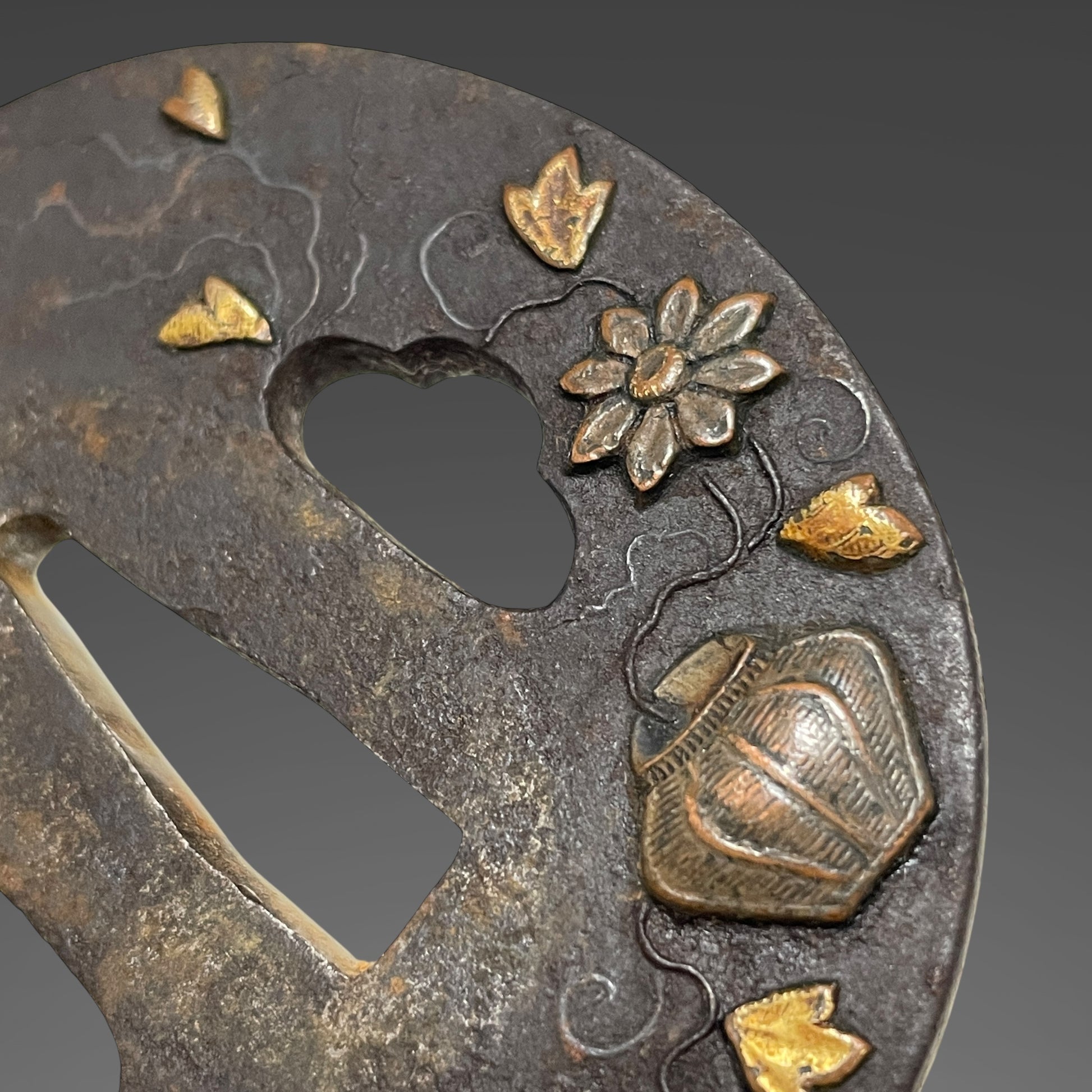 The Tsuba is decorated with flowers and vases, and is fitted with a Meuki with a persimmon motif.