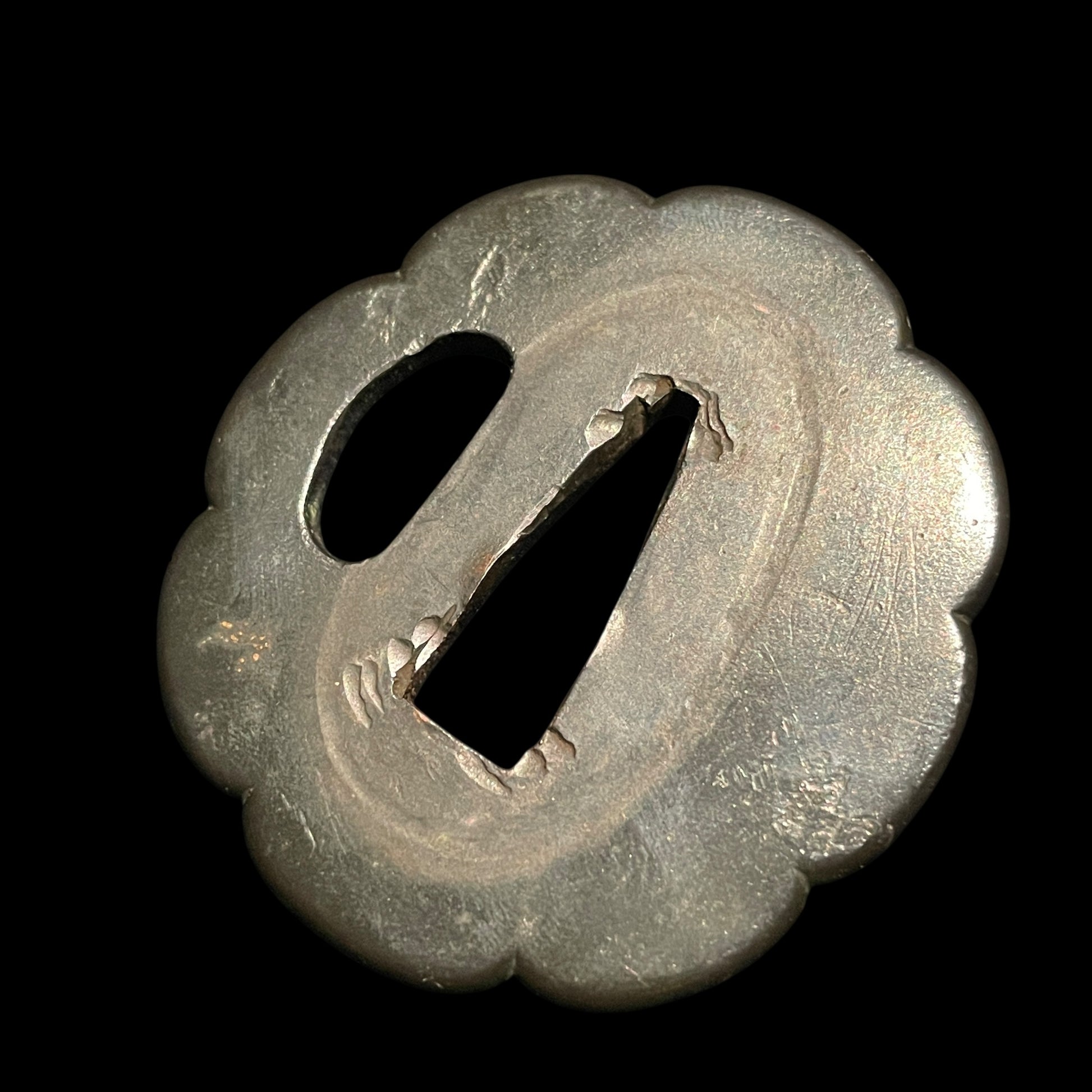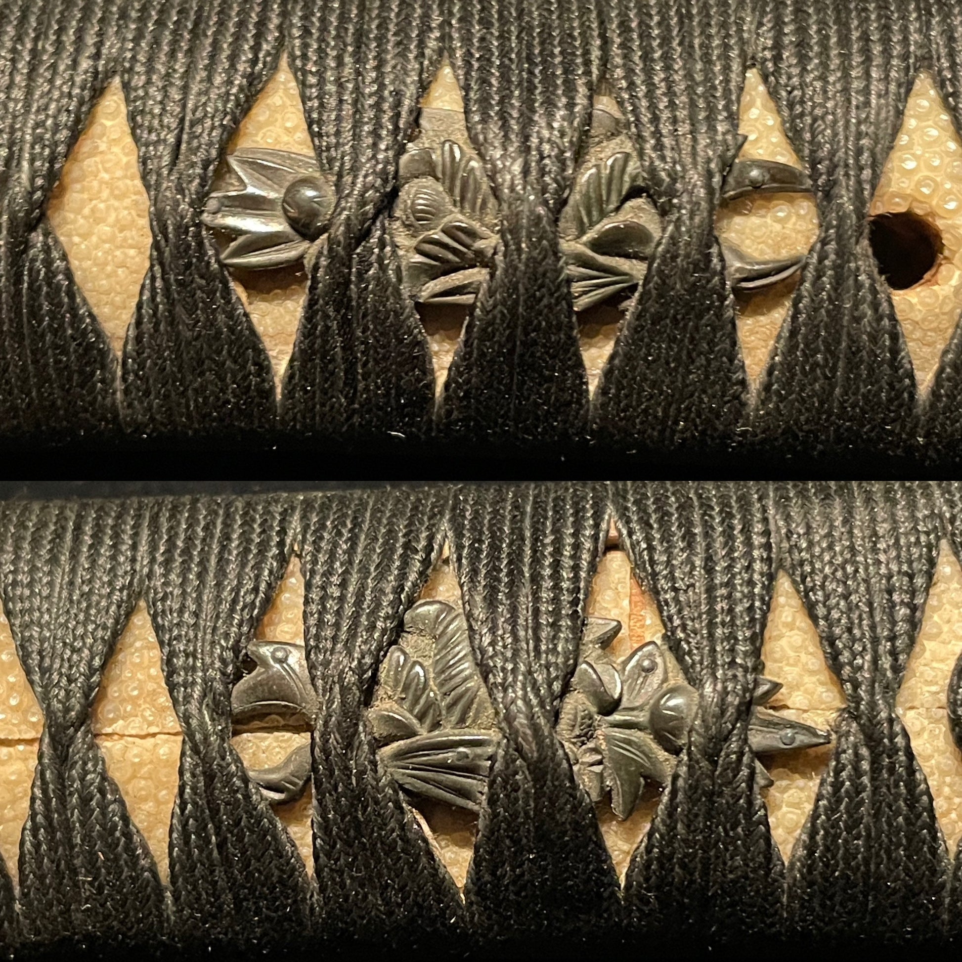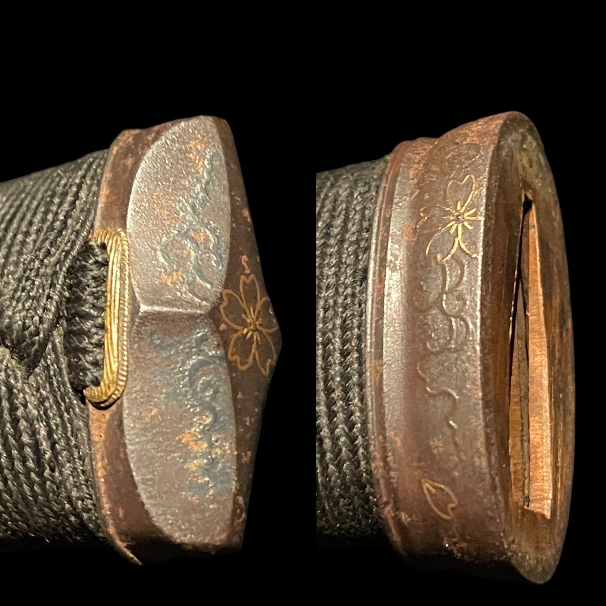 The iron Kashira has an interesting shape, the Tsuba and Menuki are made of red copper.