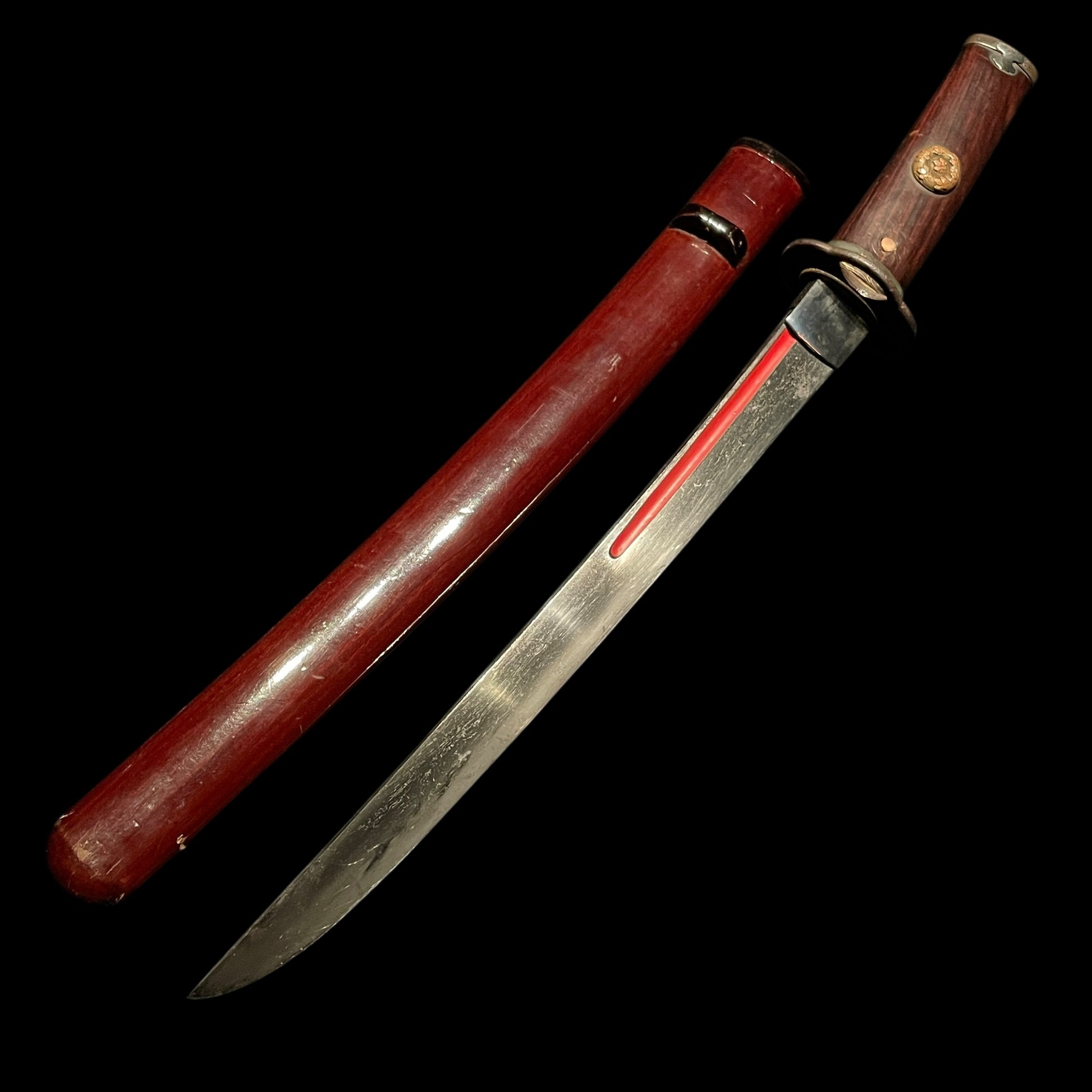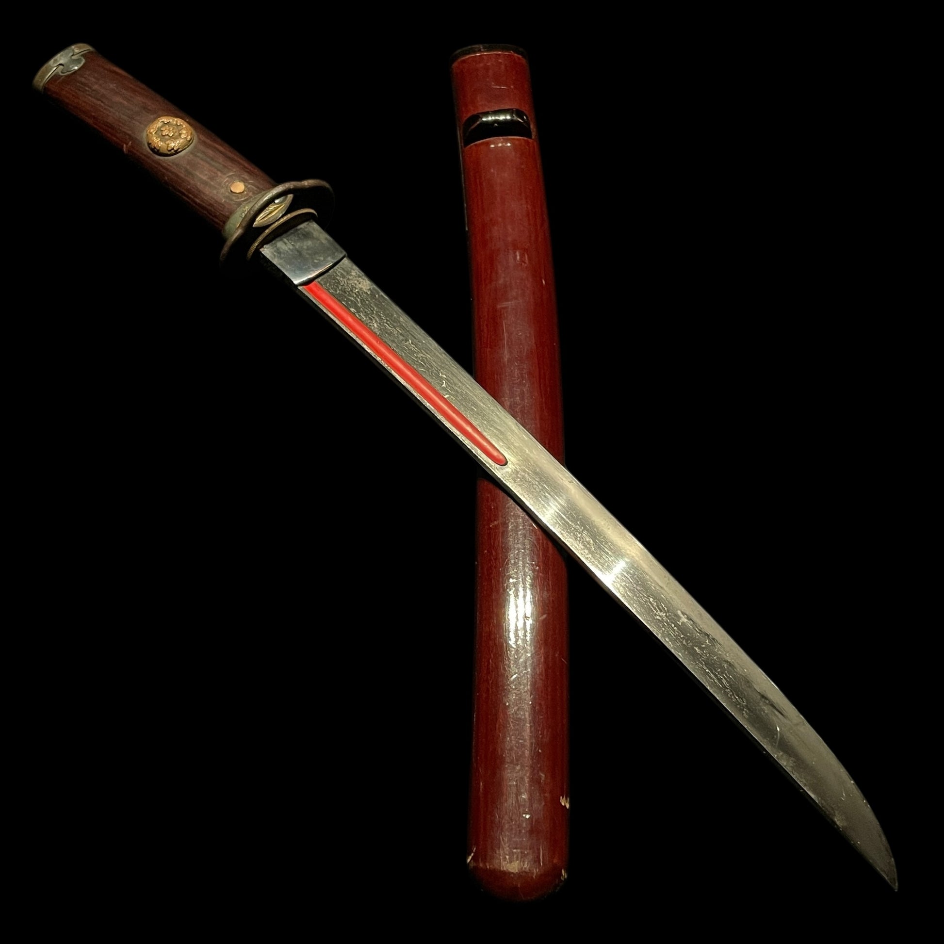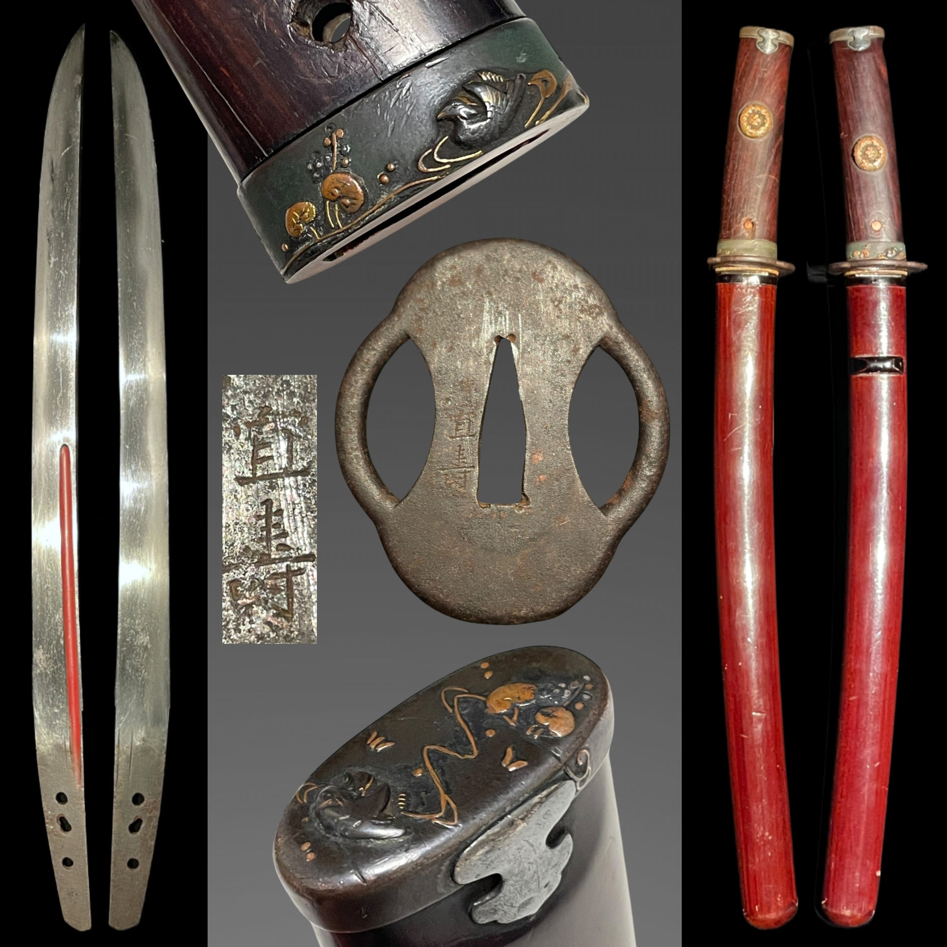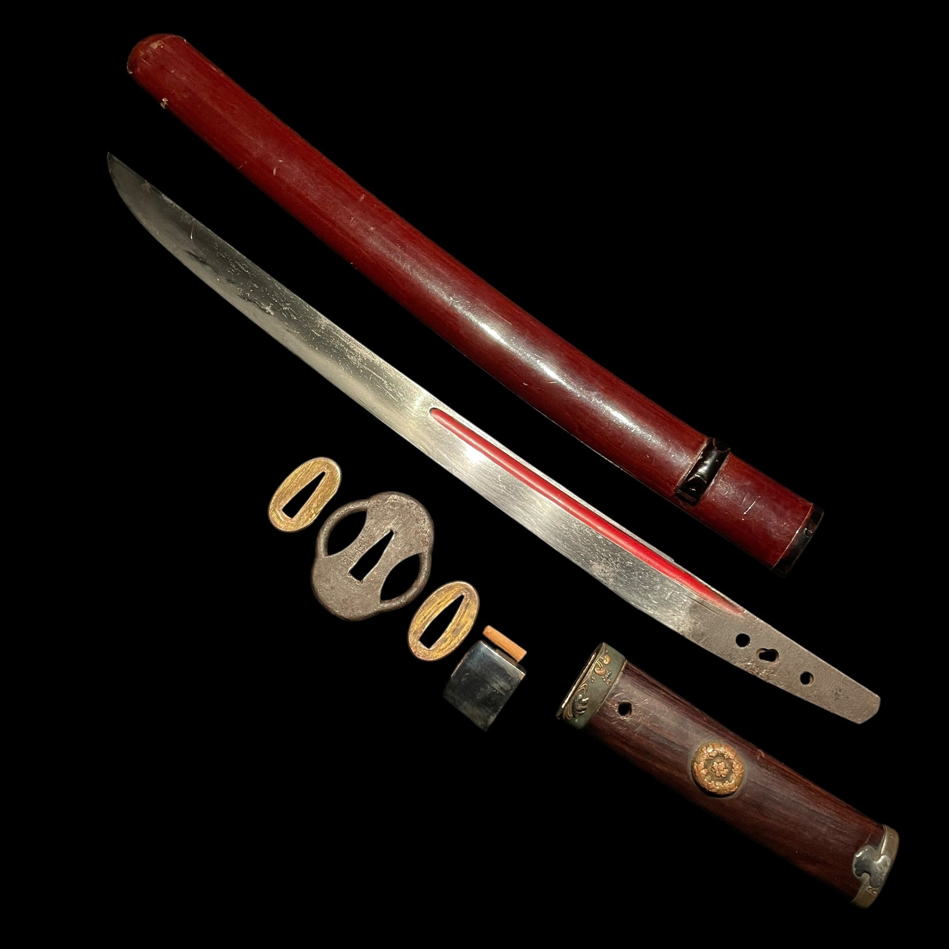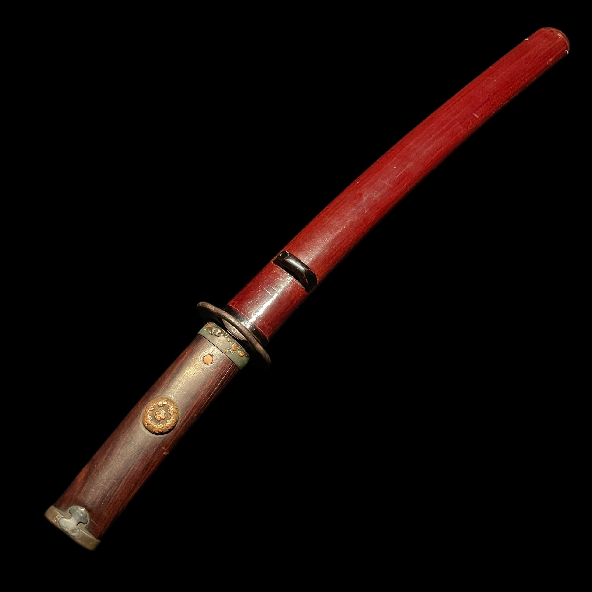 Red Wakizashi, Nobuhisa 宣壽 signed Tsuba, 朱塗腰樋 Red Koshibi, Edo period mumei
