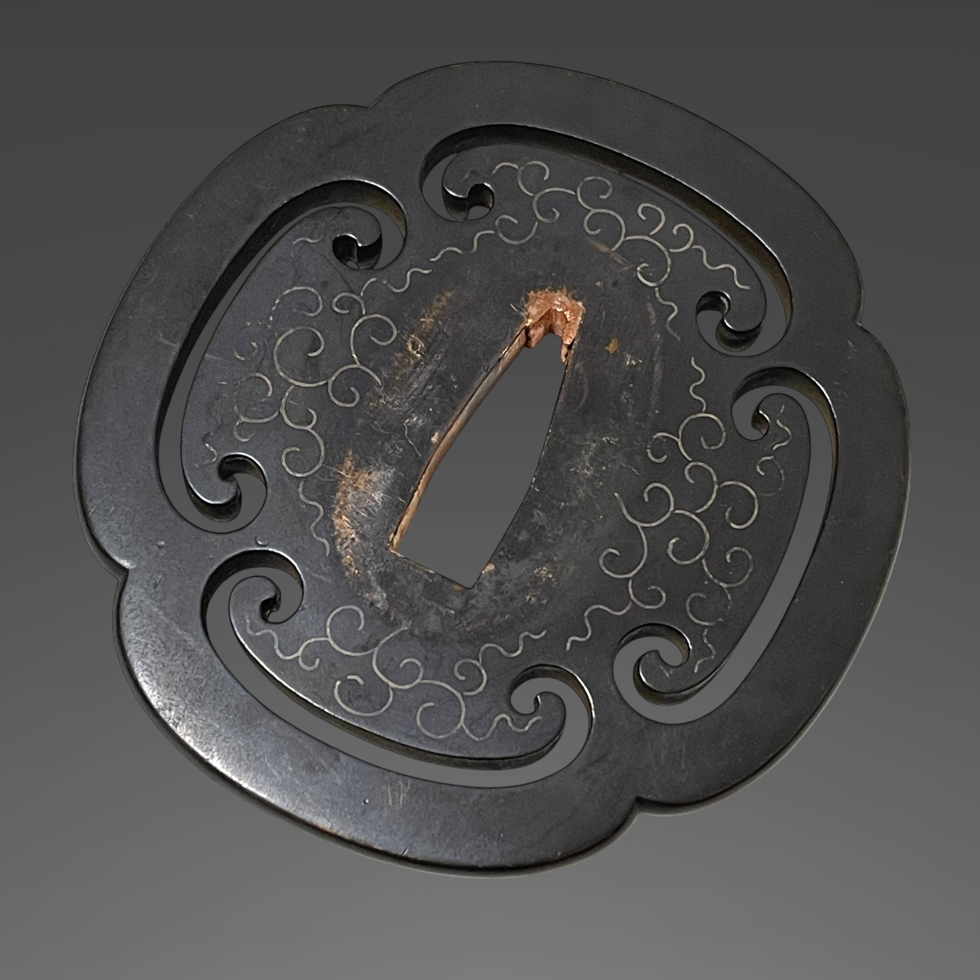 Shakudo Karakusa inlay Tsuba (赤銅唐草象嵌鍔).
