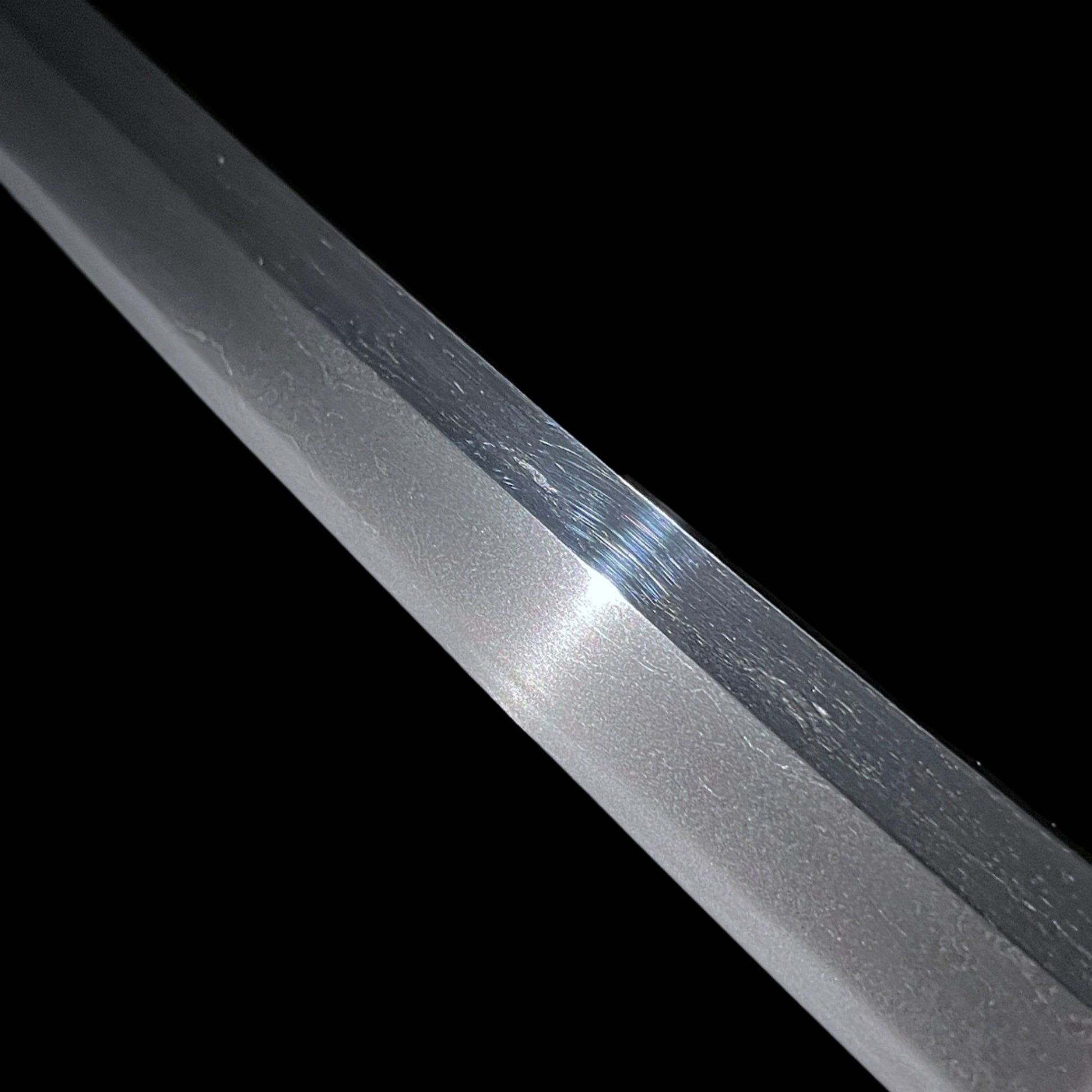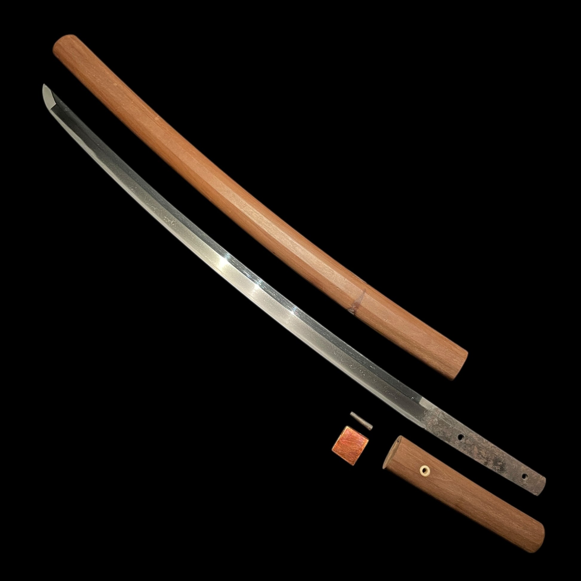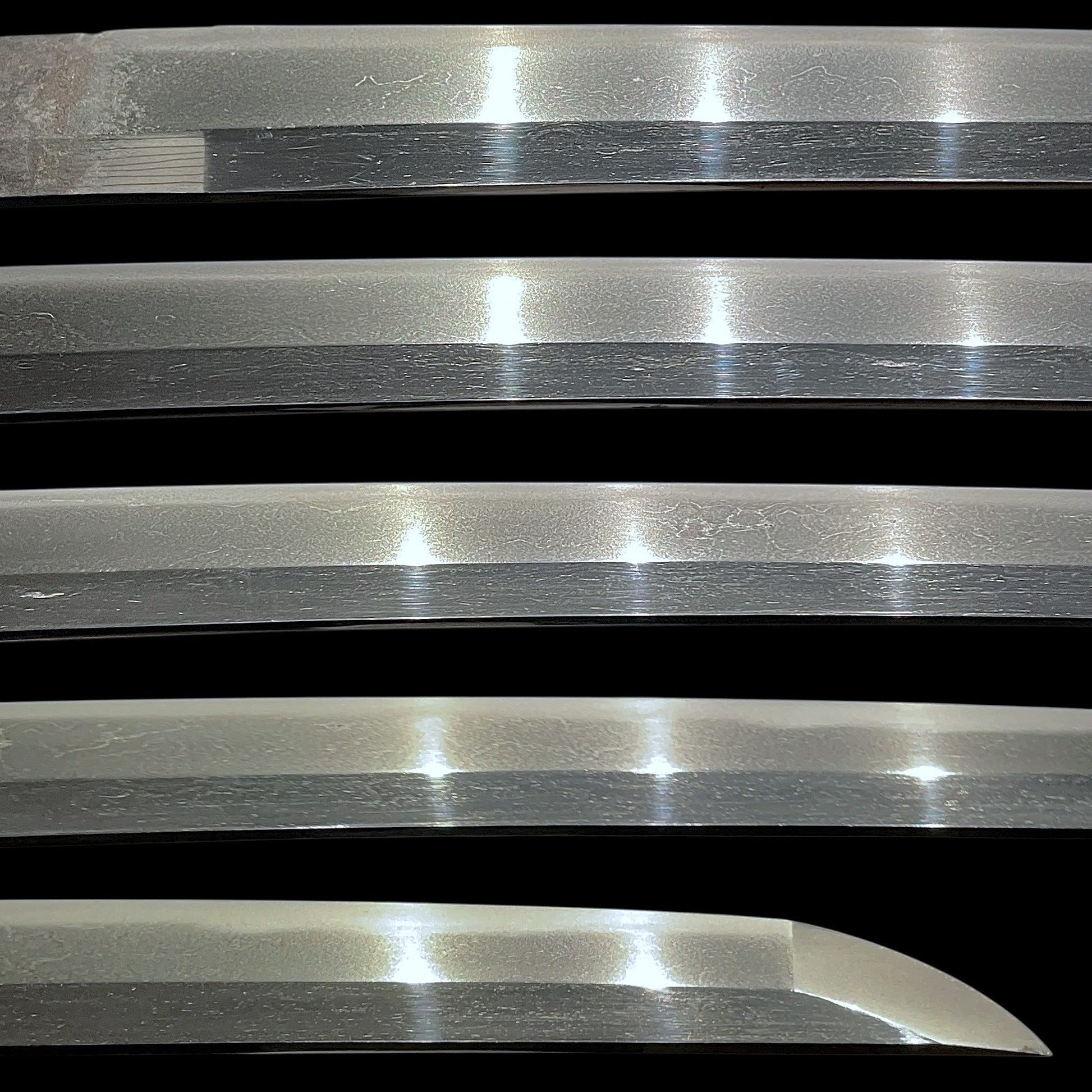 It appears to have originally been a long tachi, but after several suriage (磨上) it became the wakizashi style we see today. Oosuriage Mumei (大磨上無銘).