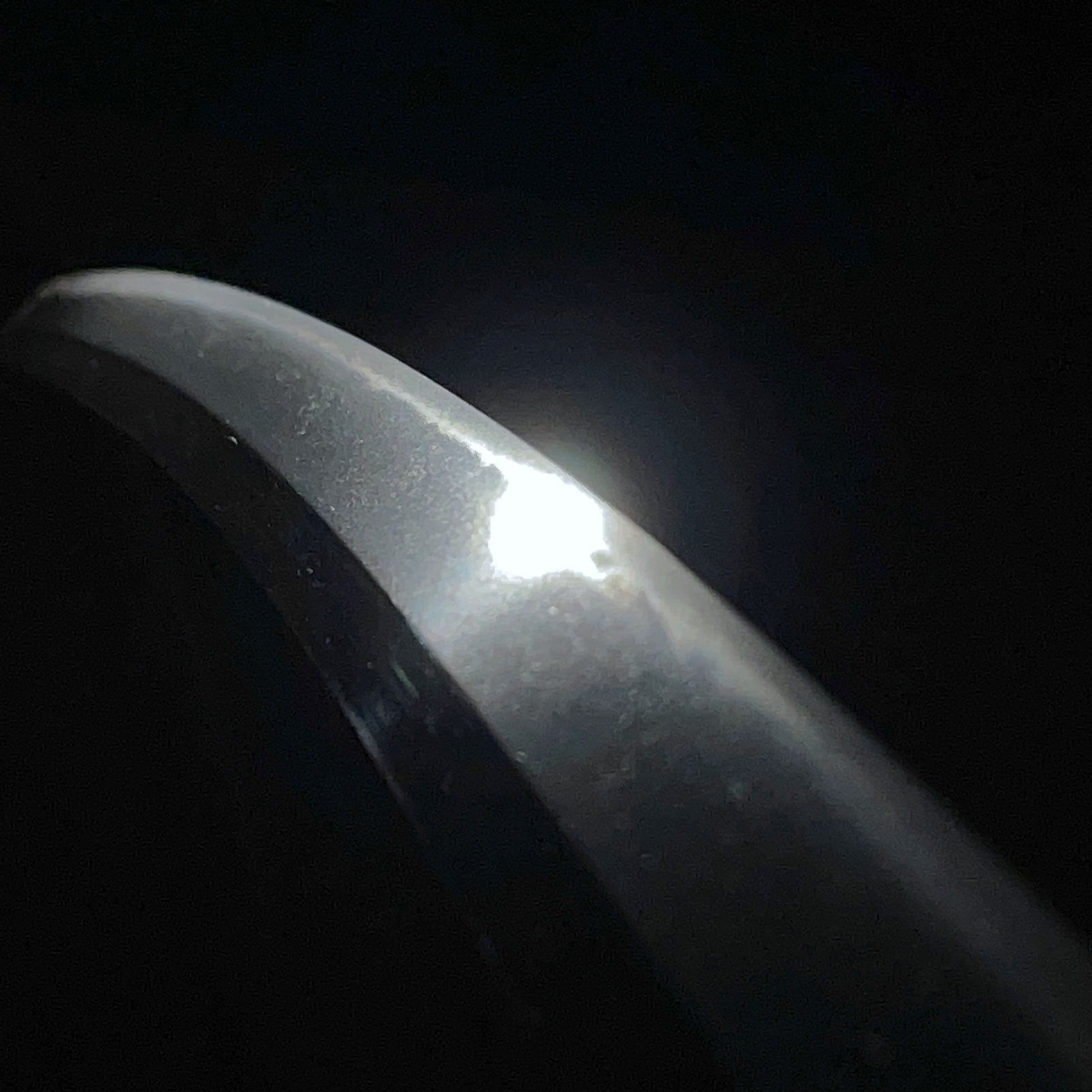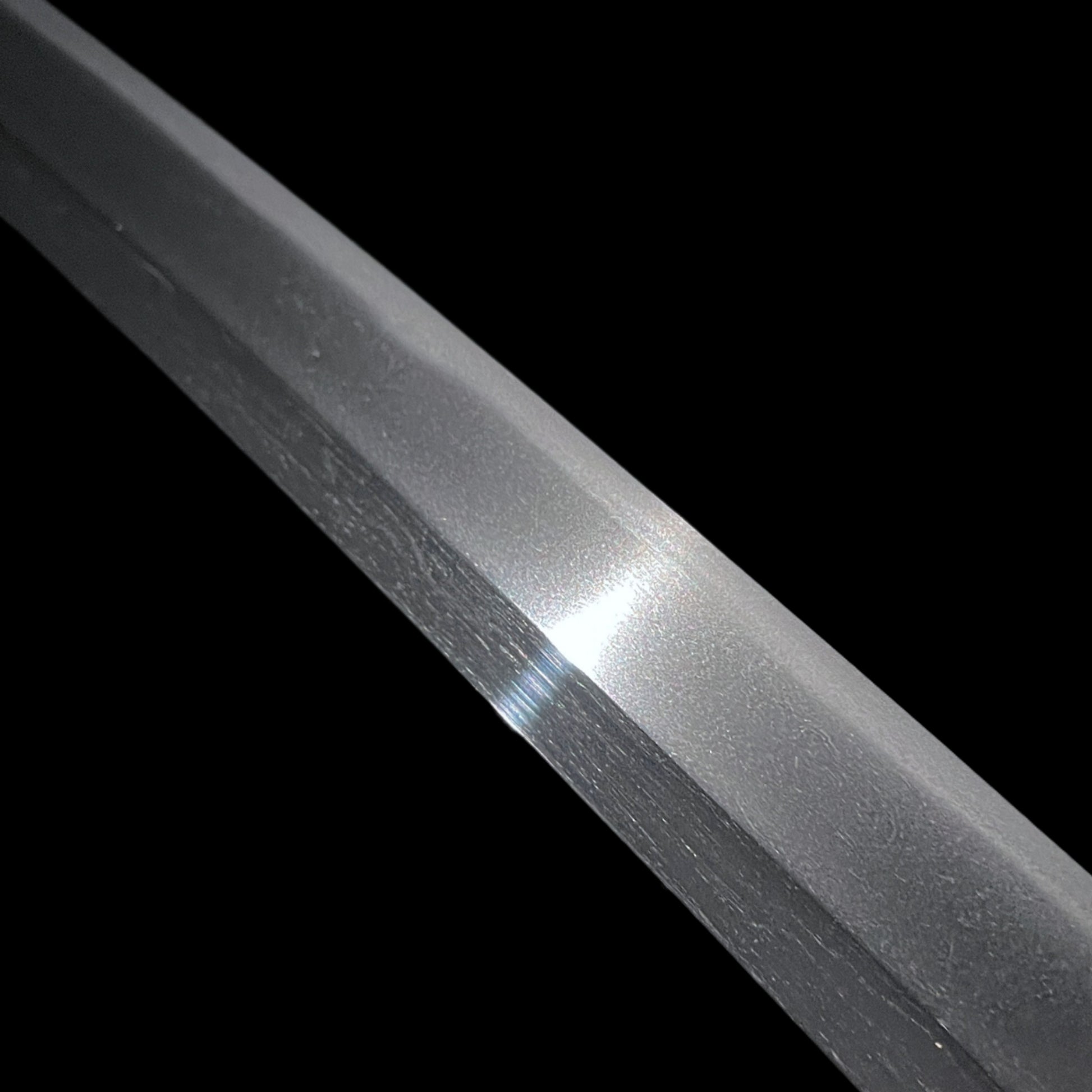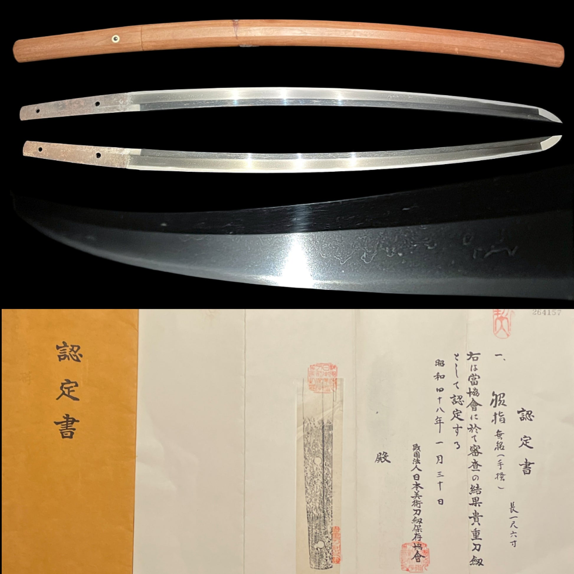 It appears to have originally been a long tachi, but after several suriage (磨上) it became the wakizashi style we see today. Oosuriage Mumei (大磨上無銘).