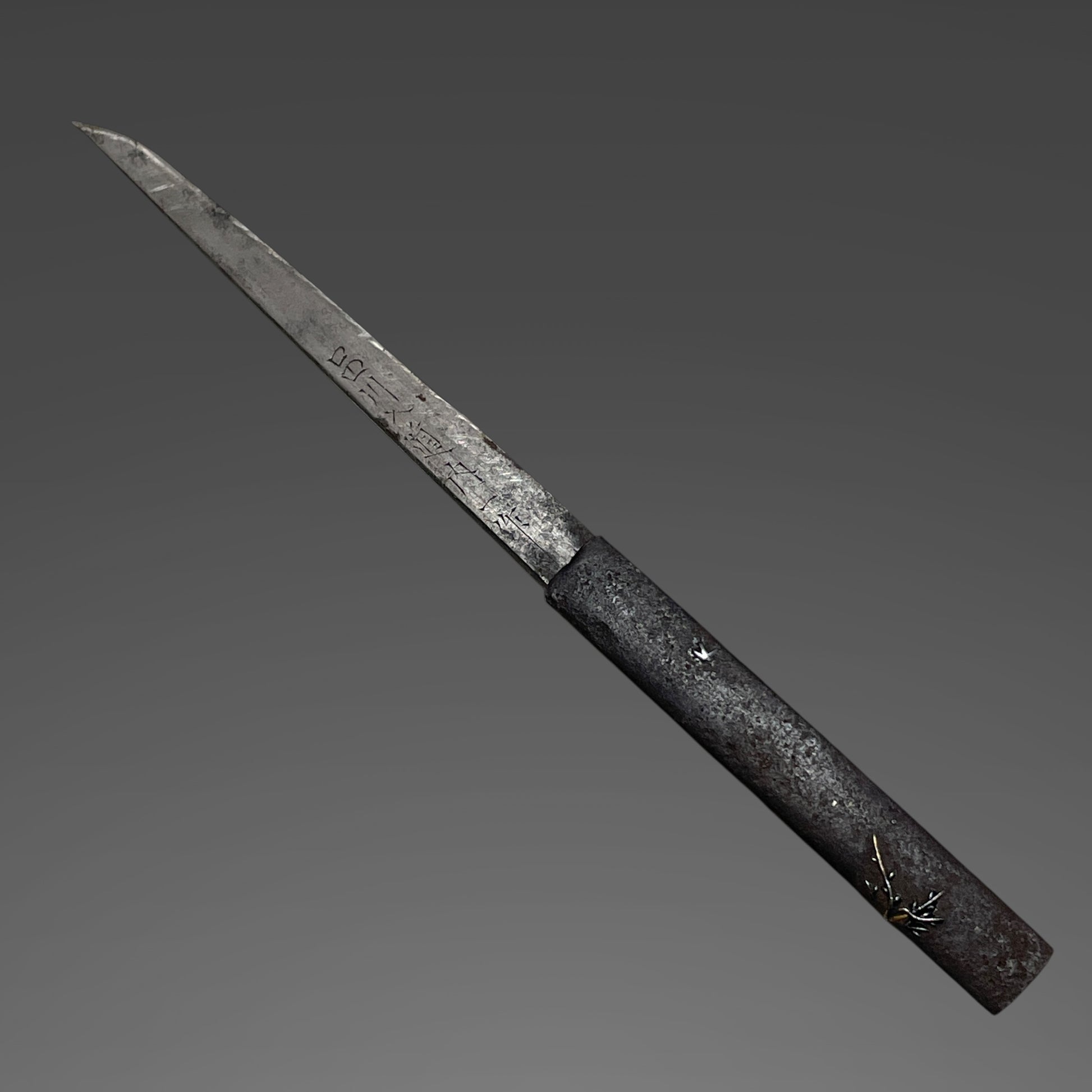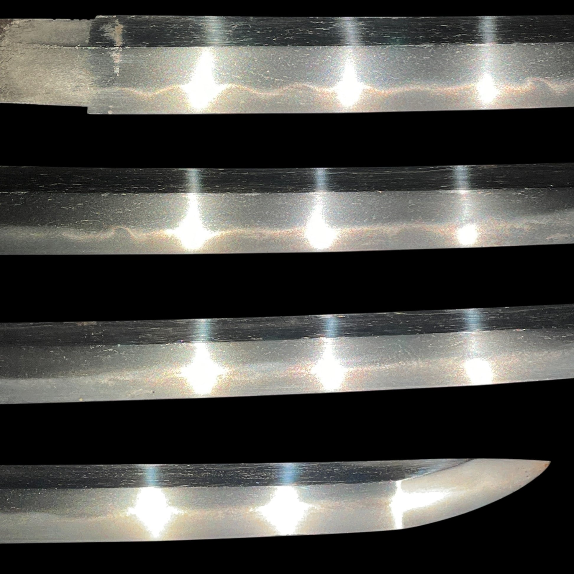 The Scabbard is a rare style Koshi-Fuemaki Saya(腰笛巻鞘), The Menuki with its shining golden tiger is a masterpiece.