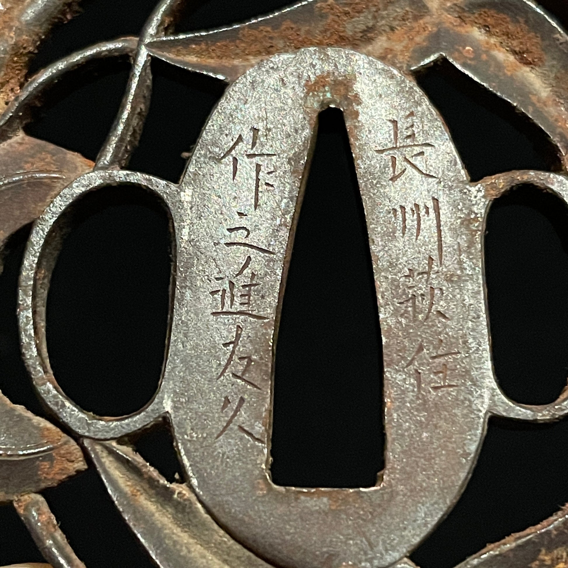 Signed Omodaka-Tsuba (沢潟鐔), Choshuhagiju Sakunoshin Tomohisa, a tsuba craftsman active during the Edo period.