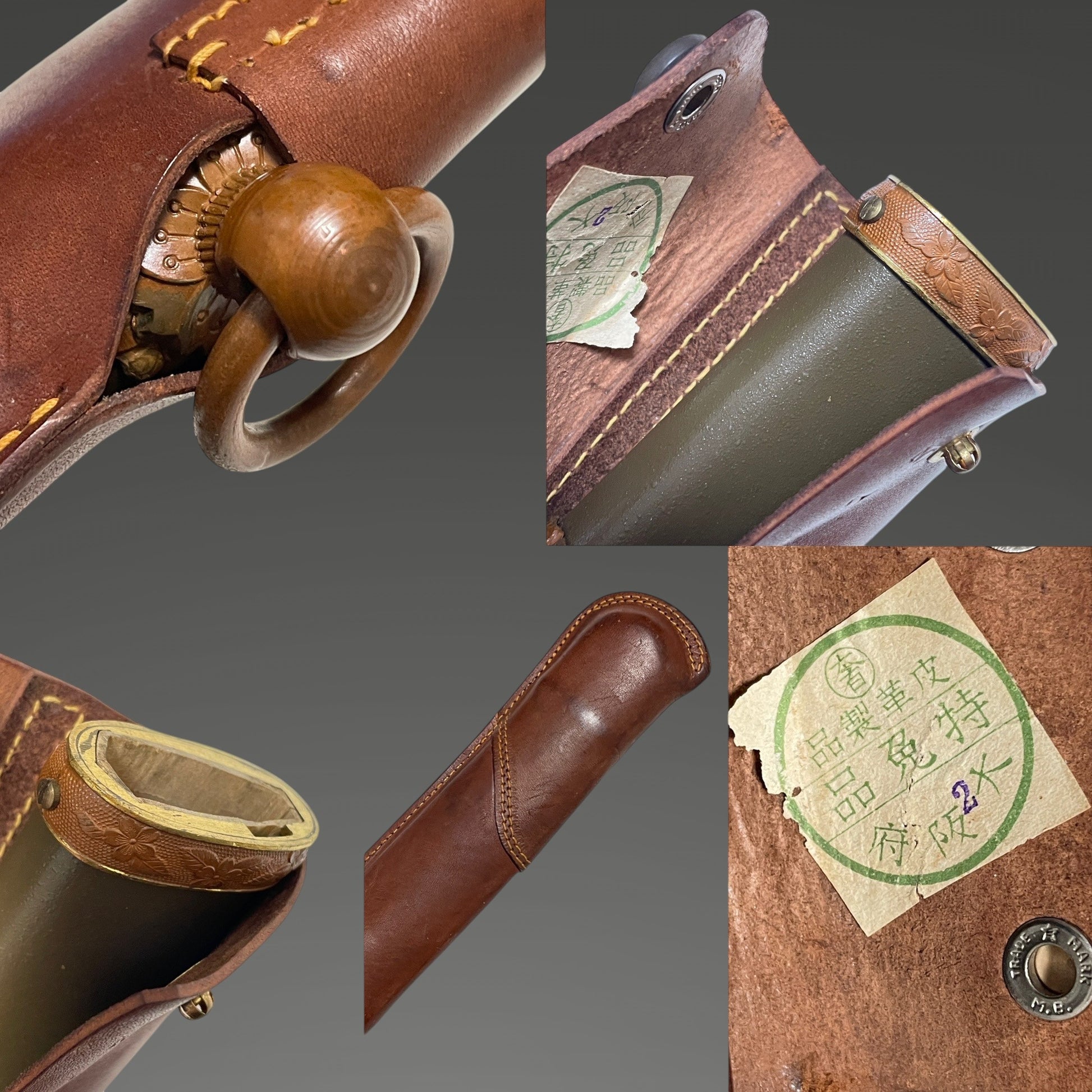 A stamp, which appears to indicate the manufacturer, can be seen on the back of the scabbard's leather cover.
