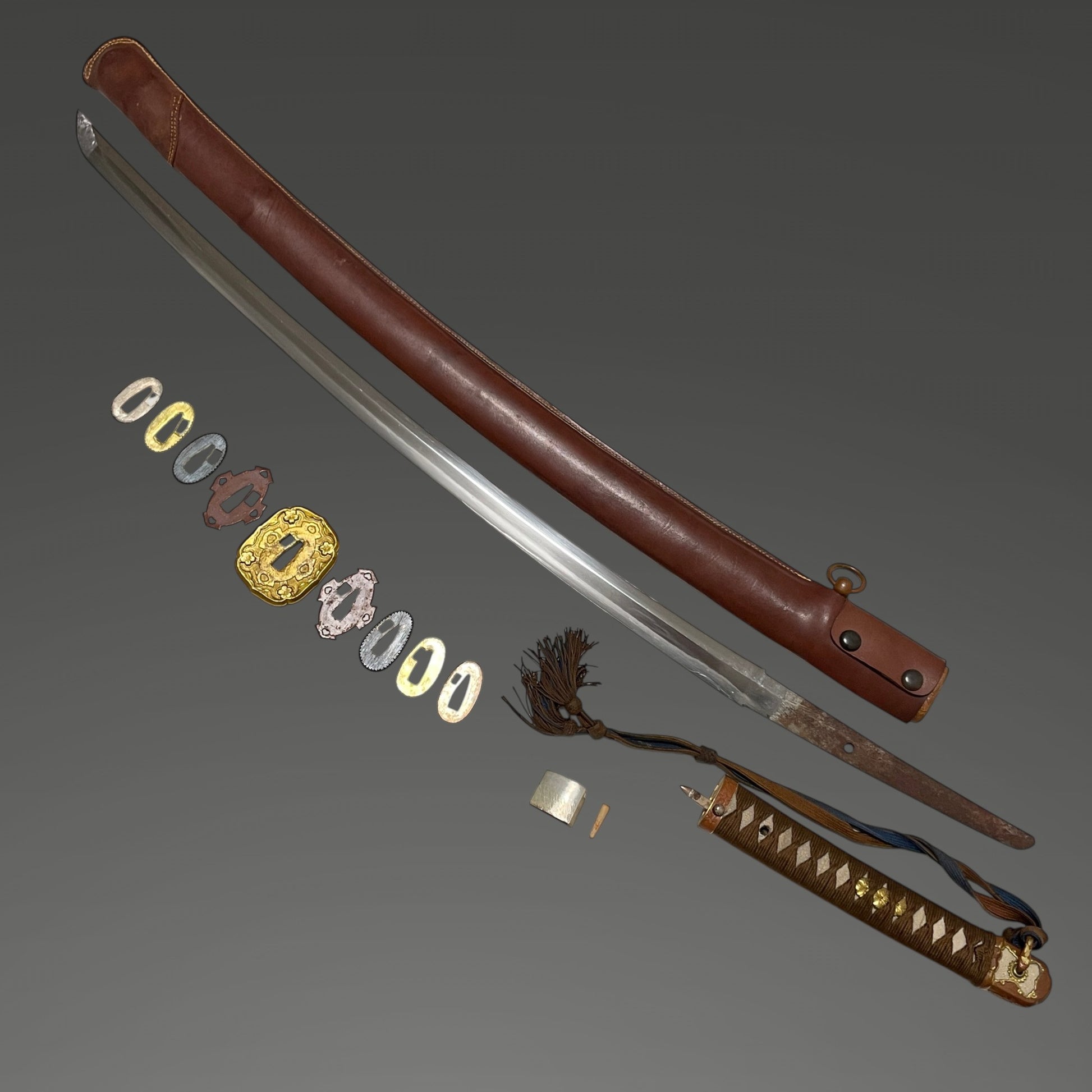 The scabbard is covered in leather, but the iron scabbard can be seen underneath.