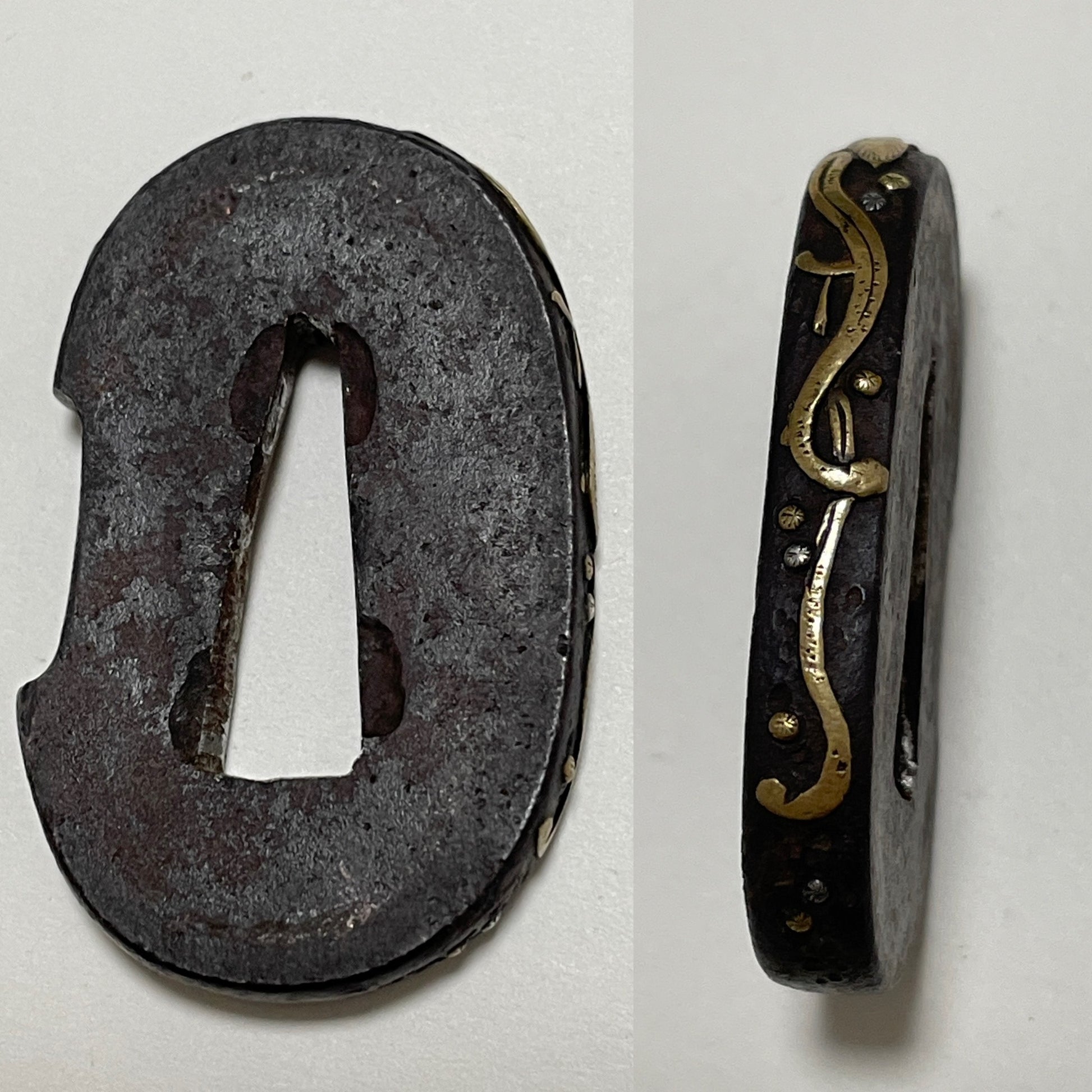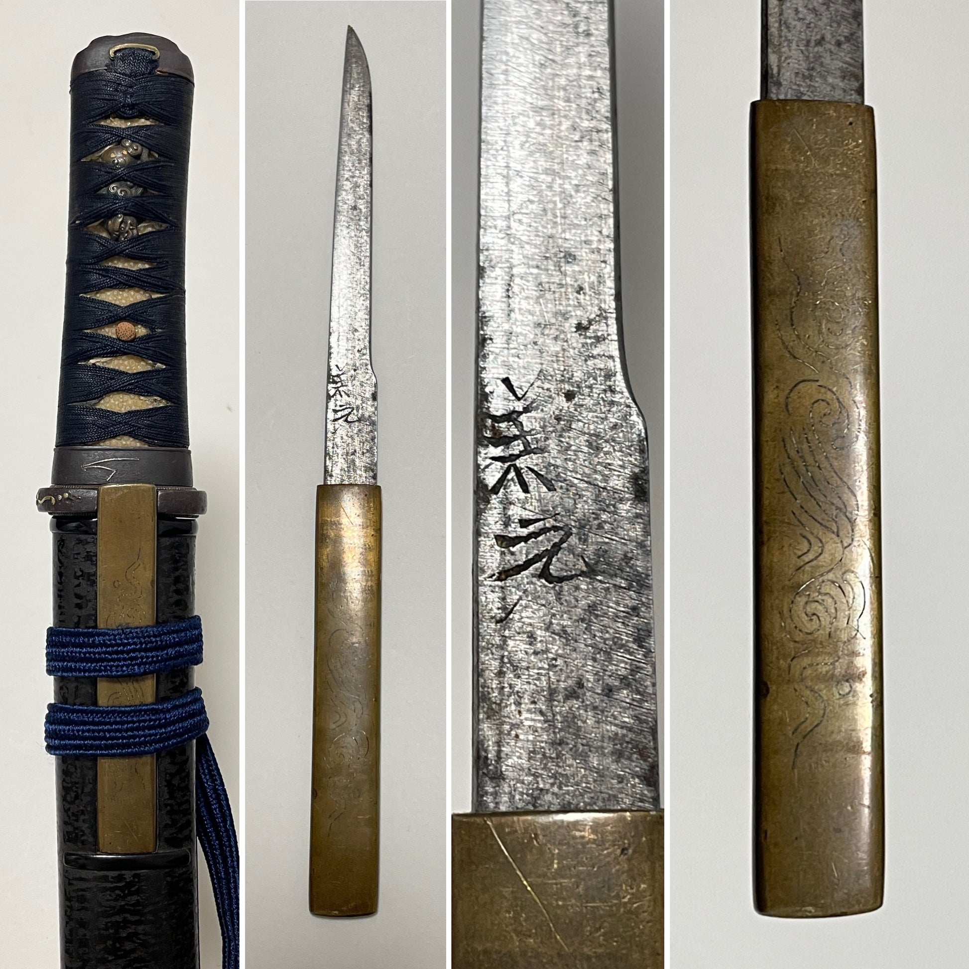 The sides of the Tsuba sword are decorated with brass inlay, and the Kozuka sword is signed by Kanemoto.